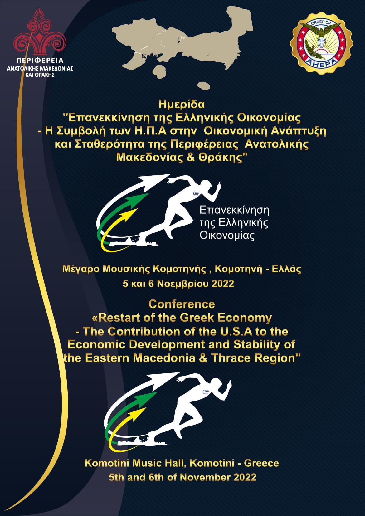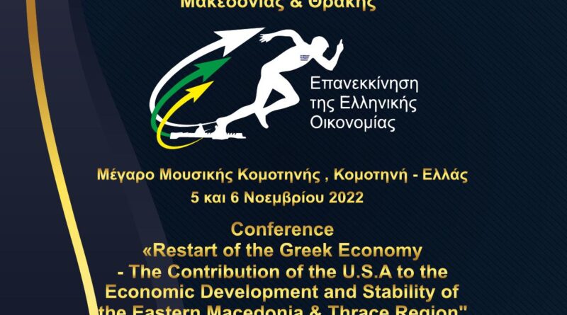 Η Περιφέρεια ανατολικής Μακεδονίας & Θράκης σε συνεργασία με την Διεθνή Πρωτοβουλία Επανεκκίνησης της Ελληνικής Οικονομίας και τους ΑΗΕΡΑ «Ορφέας» Κομοτηνής διοργανώνουν Συνέδριο με θέμα: «Επανεκκίνηση της Ελληνικής Οικονομίας – Η Συμβολή των ΗΠΑ στην Οικονομική Ανάπτυξη και Σταθερότητα της Περιφέρειας Ανατολικής Μακεδονίας και Θράκης», η οποία θα πραγματοποιηθεί το Σάββατο 5 Νοεμβρίου στο Πολιτιστικό και Συνεδριακό Κέντρο – Μέγαρο Μουσικής Κομοτηνής, με ώρα έναρξης 10:30μ.μ.. Την επόμενη μέρα Κυριακή 6 Νοεμβρίου θα πραγματοποιηθεί επίσκεψη των συνέδρων στη ΒΙΠΕ Κομοτηνής και σε ιστορικά σημεία της Ροδόπης.