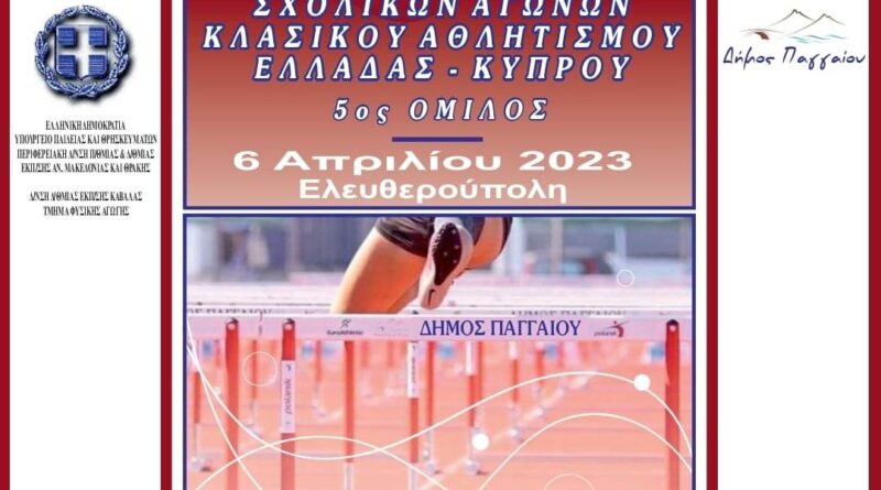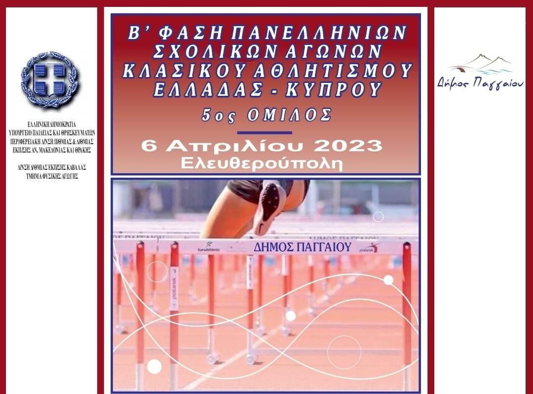 Ο Δήμος Παγγαίου και η Διεύθυνση Δευτεροβάθμιας Εκπαίδευσης Καβάλας διοργανώνουν την Β Φάση των Πανελληνίων Σχολικών Αγώνων Κλασικού Αθλητισμού ( 5ου Ομιλου) για μαθητές και μαθήτριες Λυκείων Ελλάδας και Κύπρου σχ. Έτους 2022-2023.