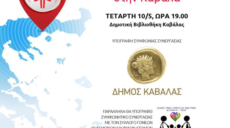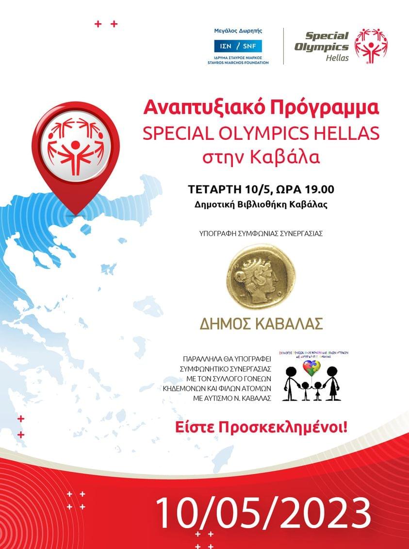 Το Τοπικό Πρόγραμμα Special Olympics Καβάλας, θα εγκαινιαστεί με την υπογραφή Συμφωνίας Συνεργασίας μεταξύ του Προέδρου των Special Olympics Hellas, Πρέσβυ ε.τ. κ. Διονύσιου Κοδέλλα, και του Δημάρχου Καβάλας κ. Θεόδωρου Μουριάδη, την Τετάρτη 10 Μαΐου και ώρα 19:00, στη Δημοτική Βιβλιοθήκη Καβάλας. Παράλληλα, θα υπογραφεί Συμφωνητικό Συνεργασίας με το Σύλλογο Γονέων Κηδεμόνων και Φίλων Ατόμων με Αυτισμό Π.Ε. Καβάλας με τον Πρόεδρο κ. Αθανάσιο Οσταδάκη.