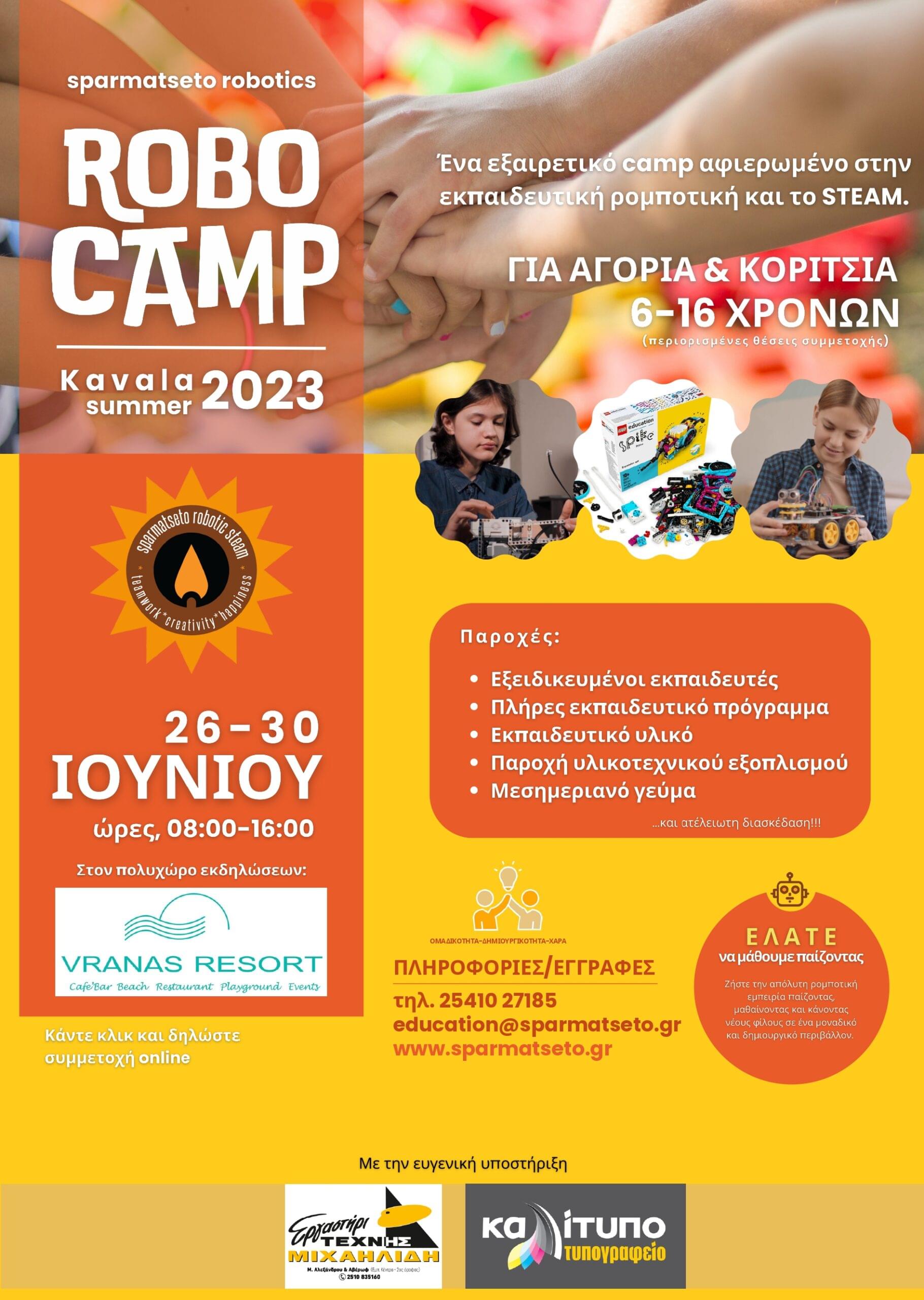 Στην Καβάλα δίπλα στη θάλασσα, στον εκπληκτικό χώρο του Vranas Resort, από τις 26 μέχρι και 30 Ιουνίου 2023 θα μάθουμε, θα κατασκευάσουμε ρομποτικά οχήματα και θα διασκεδάσουμε!!