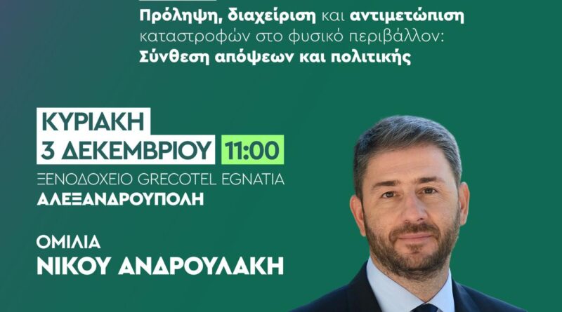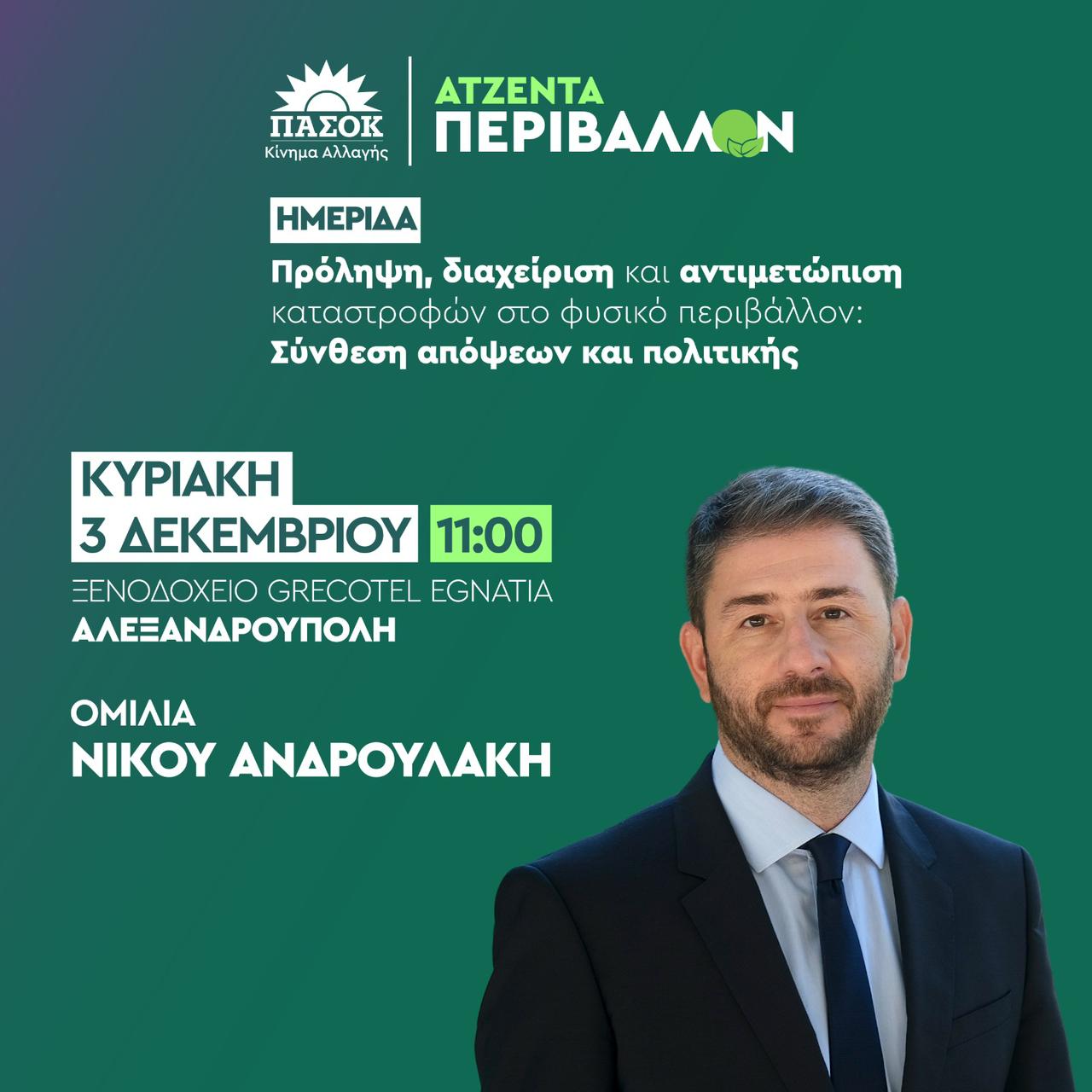 Στο πλαίσιο των δράσεων αναφορικά με την Εκδήλωση της παράταξής μας για το περιβάλλον στην Αλεξανδρούπολη, την Κυριακή 3/12/2023, με θέμα «Πρόληψη, διαχείριση και αντιμετώπιση καταστροφών στο φυσικό περιβάλλον: Σύνθεση απόψεων και πολιτικής», κατά την οποία θα υπάρξει και τοποθέτηση – ομιλία του Προέδρου μας Νίκου Ανδρουλάκη, κλιμάκιο της παράταξης μας αποτελούμενο από τους Χάρη Σεϊτανίδη (Μέλος Κεντρικής Επιτροπής ΠΑΣΟΚ), Κων/νο Κάρολο Παπαδόπουλο (Γραμ. Ν.Ε. ΠΑΣΟΚ Καβάλας), Κώστα Χατζηαναστασίου (Αναπλ. Γραμ. Ν.Ε. ΠΑΣΟΚ Καβάλας) και τους υποψήφιους βουλευτές Καϊντατζόπουλο Χρήστο, Δημήτρη Παπουτσή, Παππά Λεωνίδα και Χριστοδούλου Ευστρατία έχει προγραμματίσει επισκέψεις, την Παρασκευή 01.12.2023, στο ΓΕΩΤΕΕ (Παράρτημα Καβάλας), στην Πυροσβεστική Υπηρεσία Καβάλας και στο Δήμο Καβάλας. Αναλυτικά το πρόγραμμα των επισκέψεων έχει ως εξής: