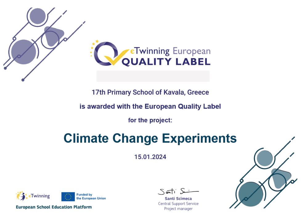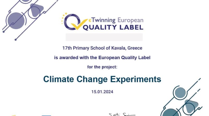 Το 17ο Δημοτικό Σχολείο Καβάλας βραβεύθηκε με την Ευρωπαϊκή Ετικέτα Ποιότητας για το e-Twinning έργο «Climate Change Experiments». Τo έργο είχε διακριθεί και με την Εθνική Ετικέτα Ποιότητας.