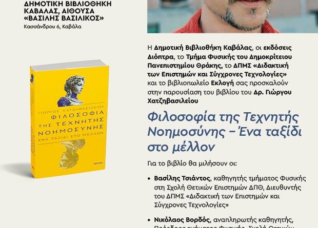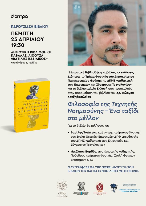 Η Δημοτική Βιβλιοθήκη Καβάλας «Βασίλης Βασιλικός», οι εκδόσεις Διόπτρα, το Τμήμα Φυσικής του Δημοκρίτειου Πανεπιστημίου Θράκης, το ΔΠΜΣ «Διδακτική των Επιστημών και Σύγχρονες Τεχνολογίες» και το βιβλιοπωλείο Εκλογή σας προσκαλούν στην παρουσίαση του βιβλίου του Δρ. Γιώργου Χατζηβασιλείου με τίτλο:«Φιλοσοφία της Τεχνητής Νοημοσύνης – Ένα ταξίδι στο μέλλον»Για το βιβλίο θα μιλήσουν οι:- Βασίλης Τσιάντος, Καθηγητής Τμήματος Φυσικής στη Σχολή Θετικών Επιστημών ΔΠΘ, Διευθυντής του ΔΠΜΣ «Διδακτική των Επιστημών και Σύγχρονες Τεχνολογίες»- Νικόλαος Βορδός, αναπληρωτής Καθηγητής, Πρόεδρος Τμήματος Φυσικής, Σχολή Θετικών Επιστημών ΔΠΘ.Η εκδήλωση θα πραγματοποιηθεί την Πέμπτη 25 Απριλίου και ώρα 19:30 στην αίθουσα εκδηλώσεων της Δημοτικής Βιβλιοθήκης (Κασσάνδρου 6, 4ος όροφος).