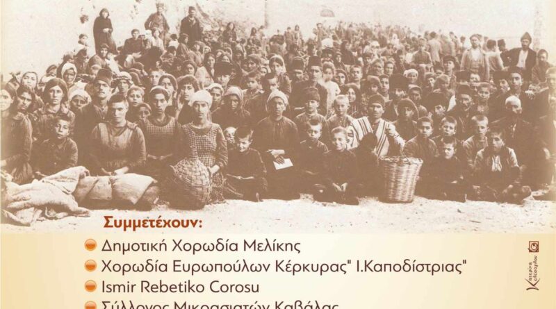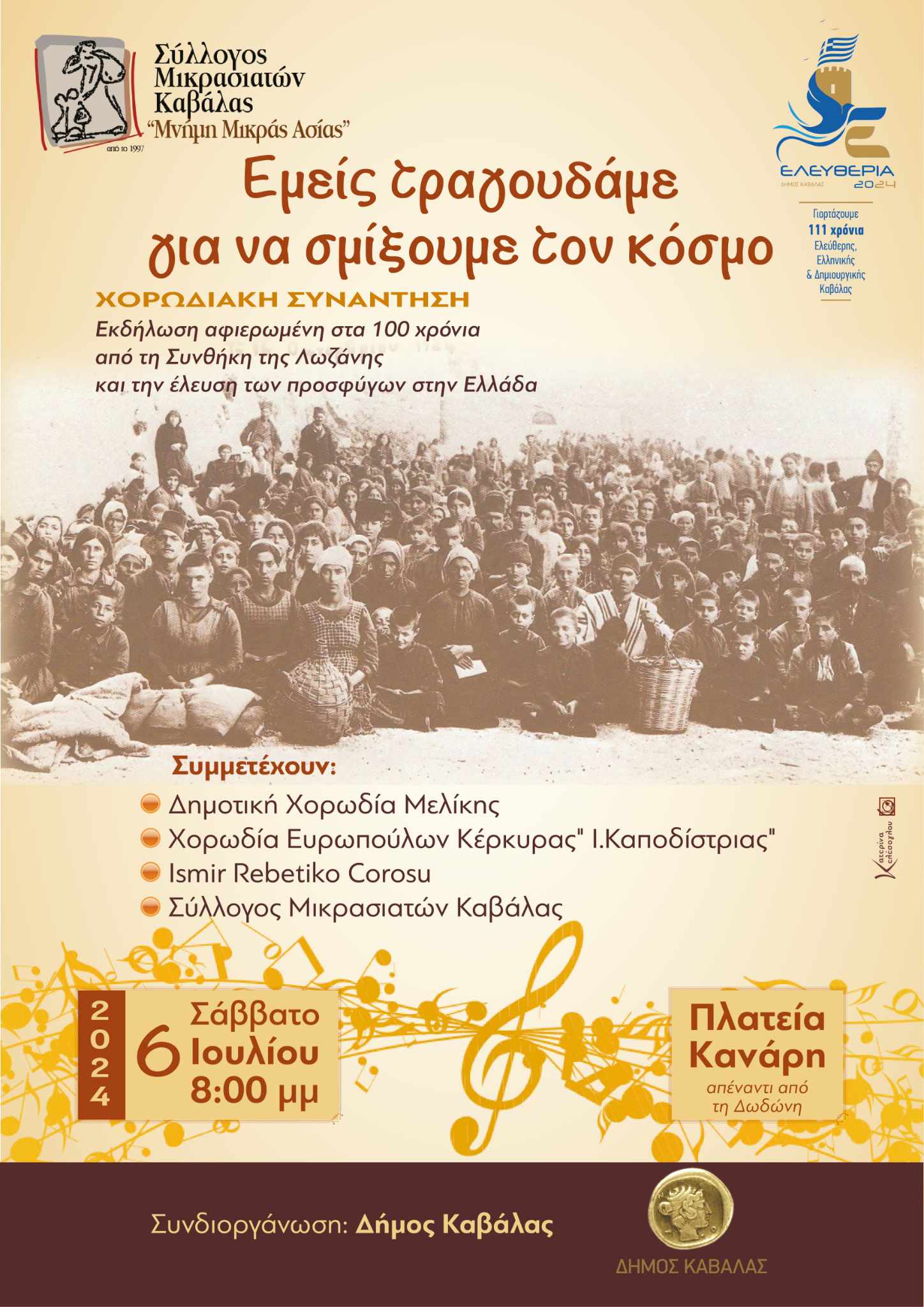 Ο Σύλλογος Μικρασιατών Καβάλας στο πλαίσιο των εκδηλώσεων για τα «ΕΛΕΥΘΕΡΙΑ» της πόλης μας σε συνεργασία με τον Δήμο Καβάλας, διοργανώνει την εκδήλωση «Εμείς τραγουδάμε για να σμίξουμε τον κόσμο». Η εκδήλωση είναι αφιερωμένη στην συμπλήρωση εκατό χρόνων από την έλευση των προσφύγων στην Ελλάδα, κατόπιν εφαρμογής της Ανταλλαγής των πληθυσμών που υπογράφηκε στην Συνθήκης της Λωζάνης το 1923. Στην εκδήλωση η οποία θα πραγματοποιηθεί το Σάββατο 6 Ιουλίου 2024 στις 8.00 μμ. στην Πλατεία Κανάρη (στην παραλία) συμμετέχουν, η «Δημοτική Χορωδία Μελίκης», η «Χορωδία Ευροπούλων Κέρκυρας Ι. Καποδίστριας» , η χορωδία «Ismir Rebetiko Corosu” και η χορωδία του Συλλόγου μας.