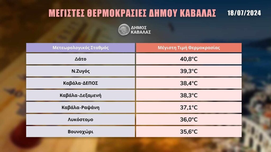 Στον παρακάτω πίνακα μπορείτε να δείτε τις μέγιστες θερμοκρασίες στο δίκτυο μετεωρολογικών σταθμών του ΔΗΜΟΥ ΚΑΒΑΛΑΣ.