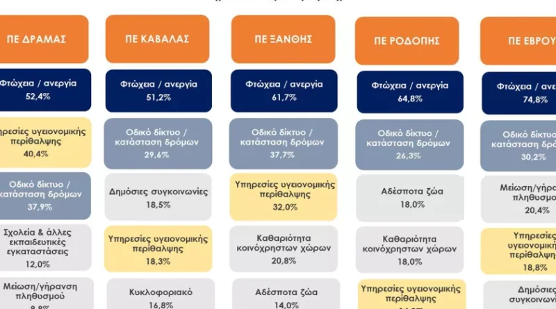 Όπως φαίνεται στο σχήμα που ακολουθεί, ανά Περιφερειακή Ενότητα, η «φτώχεια και ανεργία» αναφέρεται σε όλες ως το σημαντικότερο, αλλά με διαφορετική ένταση. Σε μεγαλύτερο ποσοστό στην Π.Ε. Έβρου (74,8%) και την Π.Ε. Ροδόπης (64,8%). Το «οδικό δίκτυο – κατάσταση δρόμων», καταγράφεται ως το δεύτερο πιο σημαντικό πρόβλημα, ιδιαίτερα από τους πολίτες της Π.Ε. Ξάνθης και της Π.Ε. Δράμας (στην οποία το πρόβλημα καταγράφεται ως τρίτο, αφού ως δεύτερο καταγράφεται το θέμα των «υπηρεσιών υγειονομικής περίθαλψης»). Ακολούθως, ανά Π.Ε., οι πολίτες αναφέρουν προβλήματα με διαφορετική σειρά και ένταση. Στην Π.Ε. Δράμας: τα σχολεία και η γήρανση του πληθυσμού. Στην Π.Ε. Καβάλας: οι δημόσιες συγκοινωνίες και το κυκλοφοριακό. Στην Π.Ε. Ξάνθης & στην Π.Ε. Ροδόπης: η καθαριότητα δημόσιων χώρων και τα αδέσποτα. Στην Π.Ε. Έβρου: η γήρανση του πληθυσμού και οι δημόσιες συγκοινωνίες.