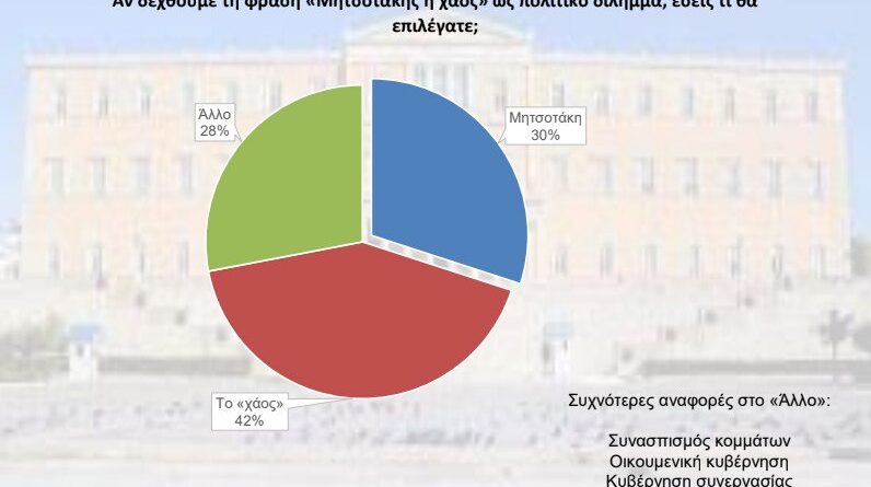 Ειδικότερα, στο πολιτικό δίλημμα «Μητσοτάκης ή χάος», το 42% των ερωτηθέντων απαντά «το χάος», έναντι 30% που επιλέγουν τον Κυριάκο Μητσοτάκη, ενώ ένα 28% δηλώνει «Άλλο». Οι συχνότερες αναφορές στην κατηγορία «Άλλο» αφορούν προτάσεις όπως συνασπισμός κομμάτων, οικουμενική κυβέρνηση, κυβέρνηση συνεργασίας ή αλλαγή πολιτικών αρχηγών.