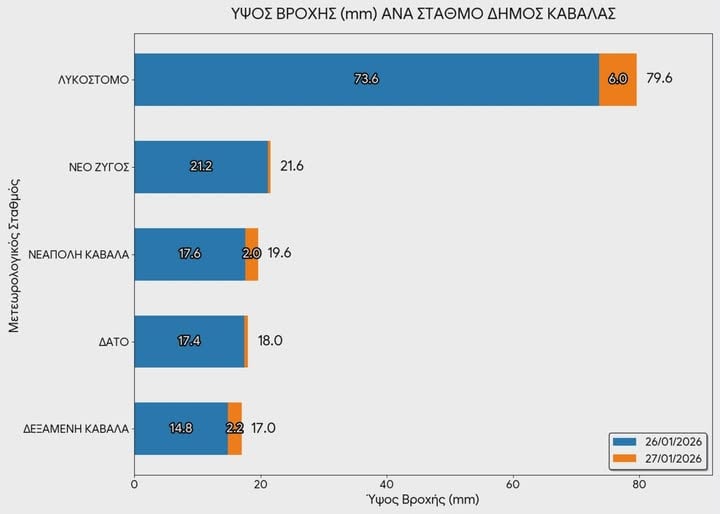 Στο σύνολο του Δήμου Καβάλας έπεσαν αξιόλογα ύψη βροχής, ενώ στο Λυκόστομο παρατηρήθηκαν μεγάλα ύψη βροχής, με τον συνολικό υετό να αγγίζει τα 80mm (80 λίτρα ανά τετραγωνικό μέτρο).