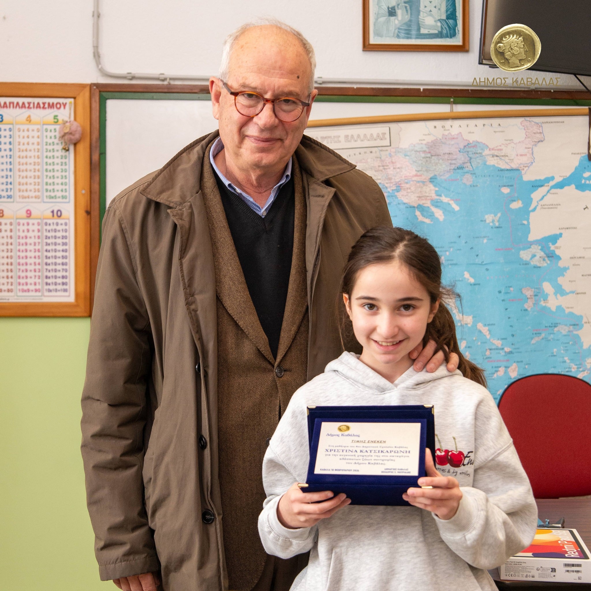 Το πρωί της Τρίτης 10 Φεβρουαρίου ο Δήμαρχος Καβάλας, Θόδωρος Μουριάδης, συνοδευόμενος από τους Αντιδημάρχους Καθαριότητας και Προστασίας Ζώων Συντροφιάς, Χρήστου Τσιτσιλικάκη και Παιδείας, Χριστόδουλου Μιχαλάκη, συνάντησε τις τρεις μαθήτριες στις σχολικές τους μονάδες και τις συνεχάρη για το ενδιαφέρον και την αγάπη τους προς τα αδέσποτα ζώα. Παράλληλα, τις απένειμε τιμητικές πλακέτες, ενώ δώρισε και ένα από tablet στις τάξεις που φοιτούν, για τη αναβάθμιση των συνθηκών διδασκαλίας και μάθησης.