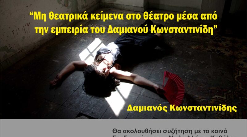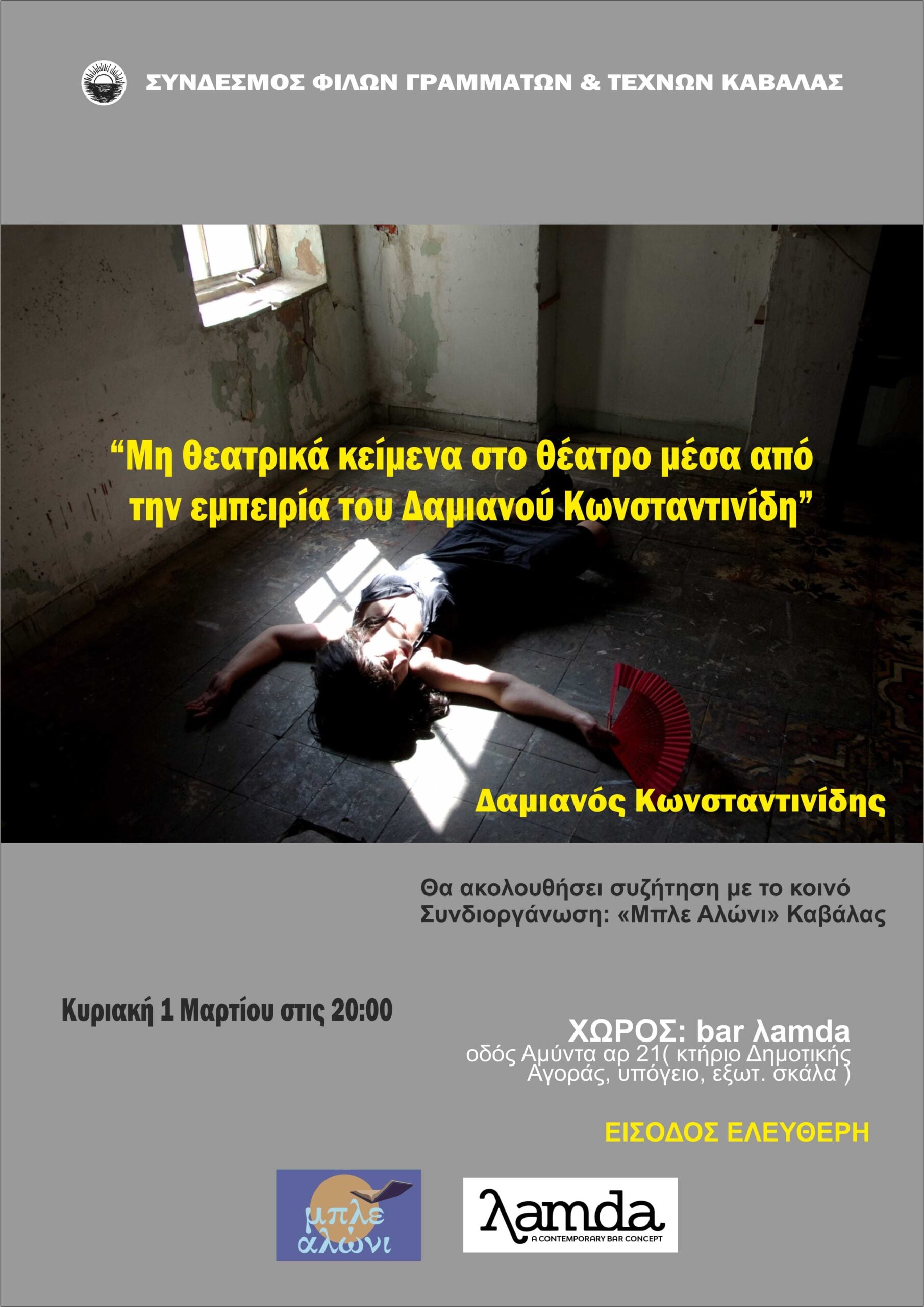 Την Κυριακή 1 Μαρτίου στις 20:00, στον Πολυχώρο «λamda» στην Καβάλα, ο Σύνδεσμος Φίλων Γραμμάτων και Τεχνών (Σ.Φ.Γ.Τ.) Καβάλας και η Λέσχη Ανάγνωσης Μπλε Αλώνι διοργανώνουν εκδήλωση με τίτλο «Μη θεατρικά κείμενα στο θέατρο μέσα από την εμπειρία του Δαμιανού Κωνσταντινίδη».