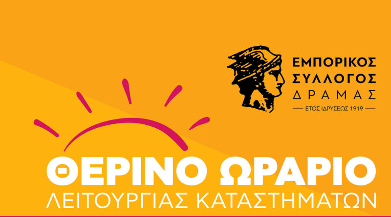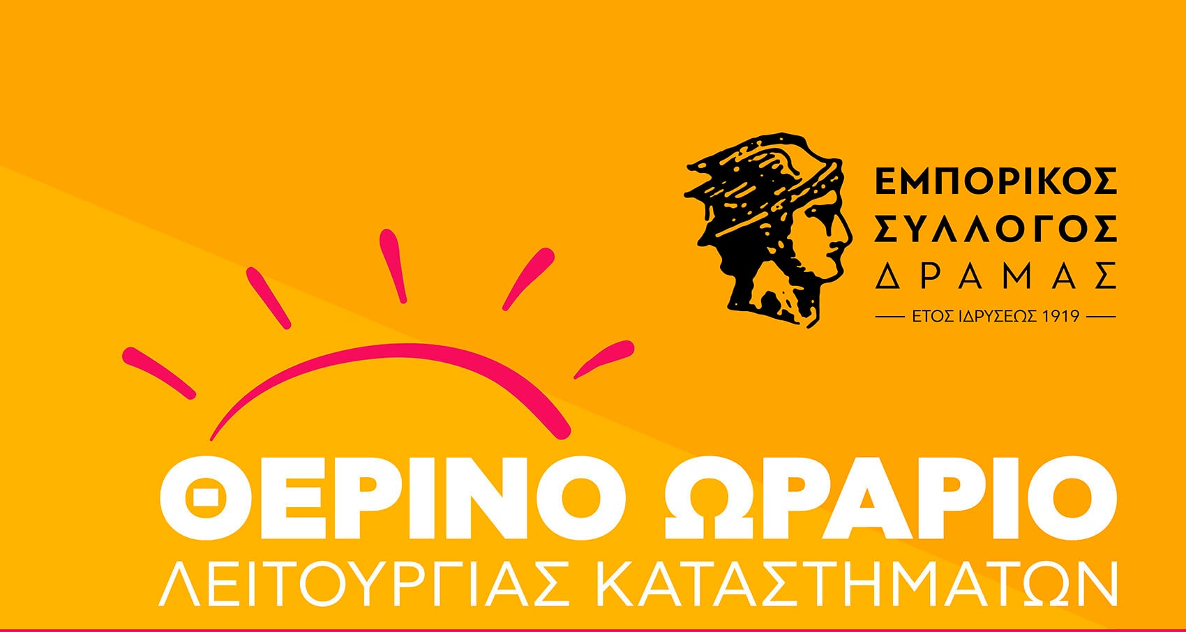 Το θερινό ωράριο λειτουργίας των εμπορικών καταστημάτων ανακοίνωσε ο Εμπορικός Σύλλογος Δράμας, καλώντας καταναλωτές και επαγγελματίες να προσαρμοστούν στο νέο πρόγραμμα.