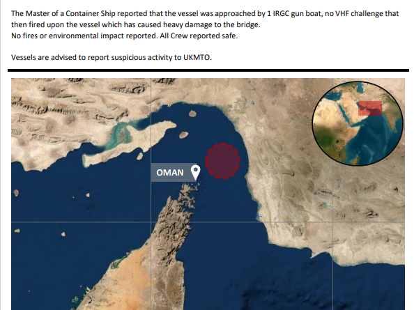 Περιπολικό των Φρουρών της Επανάστασης άνοιξε πυρ χωρίς προειδοποίηση κατά πλοίου μεταφοράς εμπορευματοκιβωτίων ελληνικών συμφερόντων.